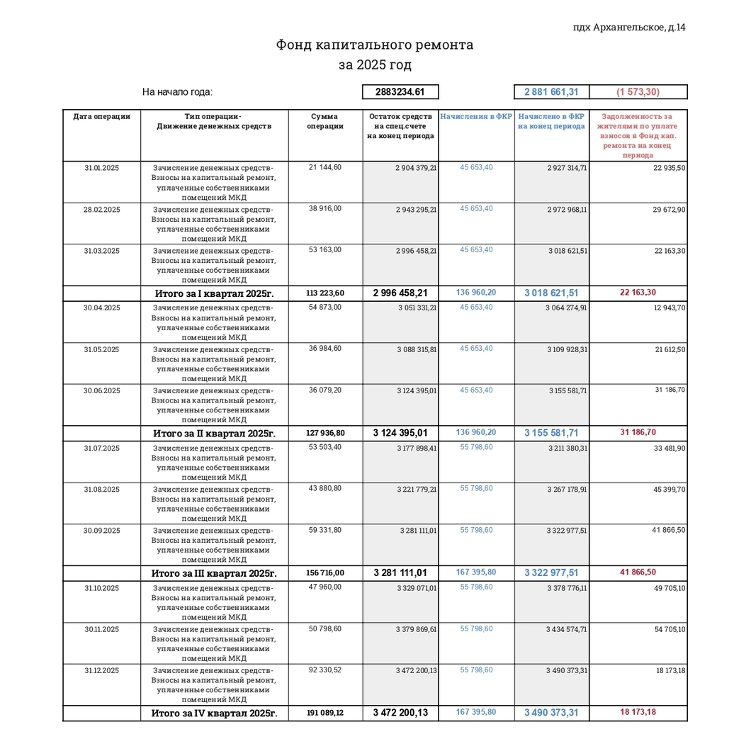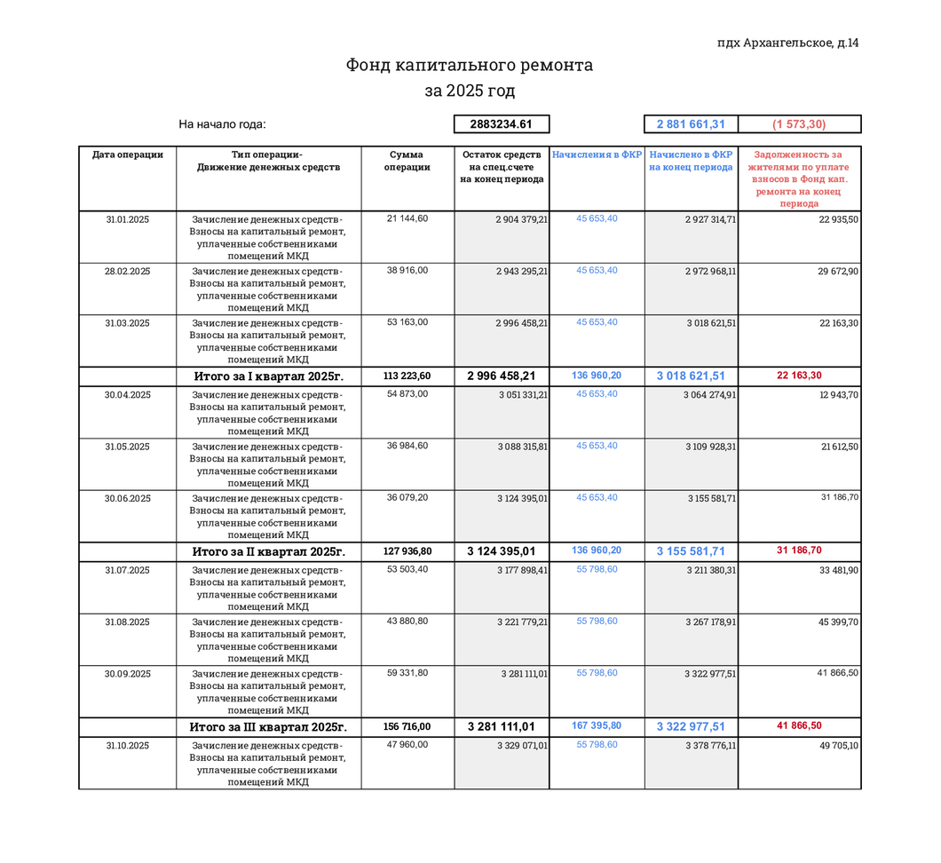 Перечисление денежных средств с иного счета, открытого в целях формирования фонда капитального ремонта многоквартирного дома | 253 605.11 | |