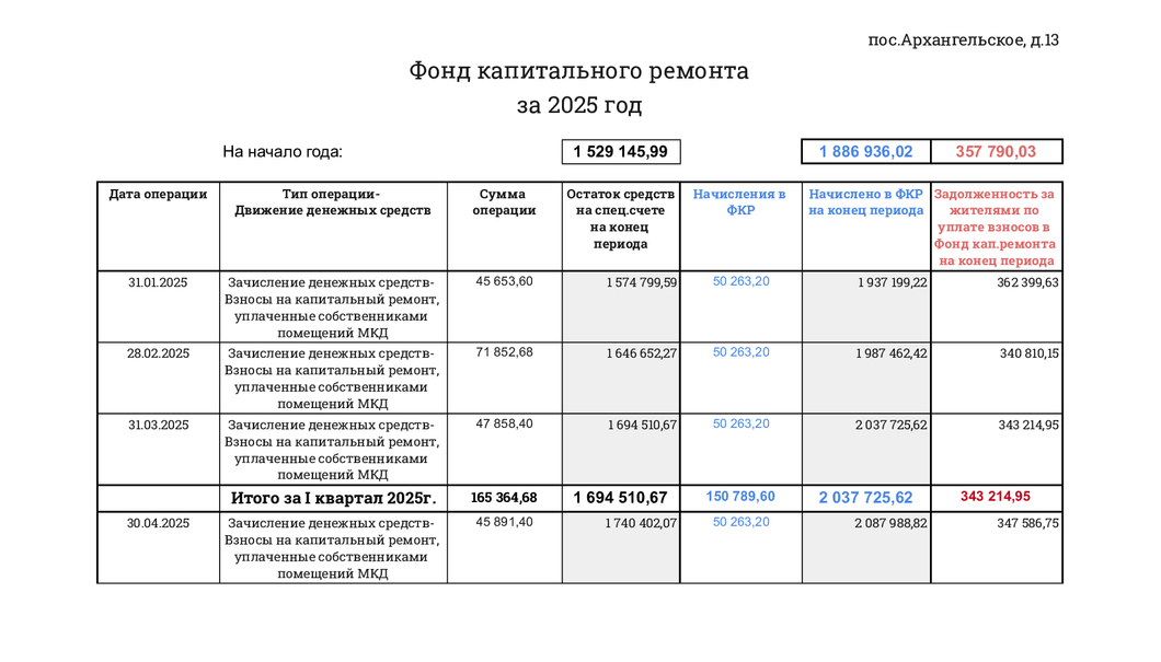 Перечисление денежных средств с иного счета, открытого в целях формирования фонда капитального ремонта многоквартирного дома | 540 152.82 | |
